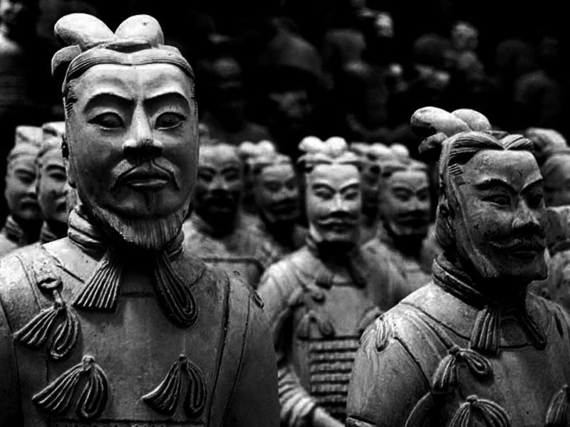 A dinastia Qin ofereceu ao mundo um dos mais notáveis conjuntos de esculturas conhecido, o exército de terracota do túmulo do primeiro imperador, Qin Shi Huangdi (Fig.3). O exército de terracota encontra-se nas imediações do túmulo propriamente dito. Trata-se da reprodução em terracota em escala natural de mais de sete mil soldados de infantaria (Figura 5), seiscentos cavalos, carros ligeiros, armas, enfim, das forças armadas do imperador em formação de combate para o protegerem no Além, revelando assim o desenvolvimento técnico-militar da época. Apesar de todas as figuras serem feitas a partir de moldes e a meio caminho entre a cerâmica e a escultura, foram tornadas únicas pela individualização de rostos, penteados, mãos, barbas, orelhas e chapéus.