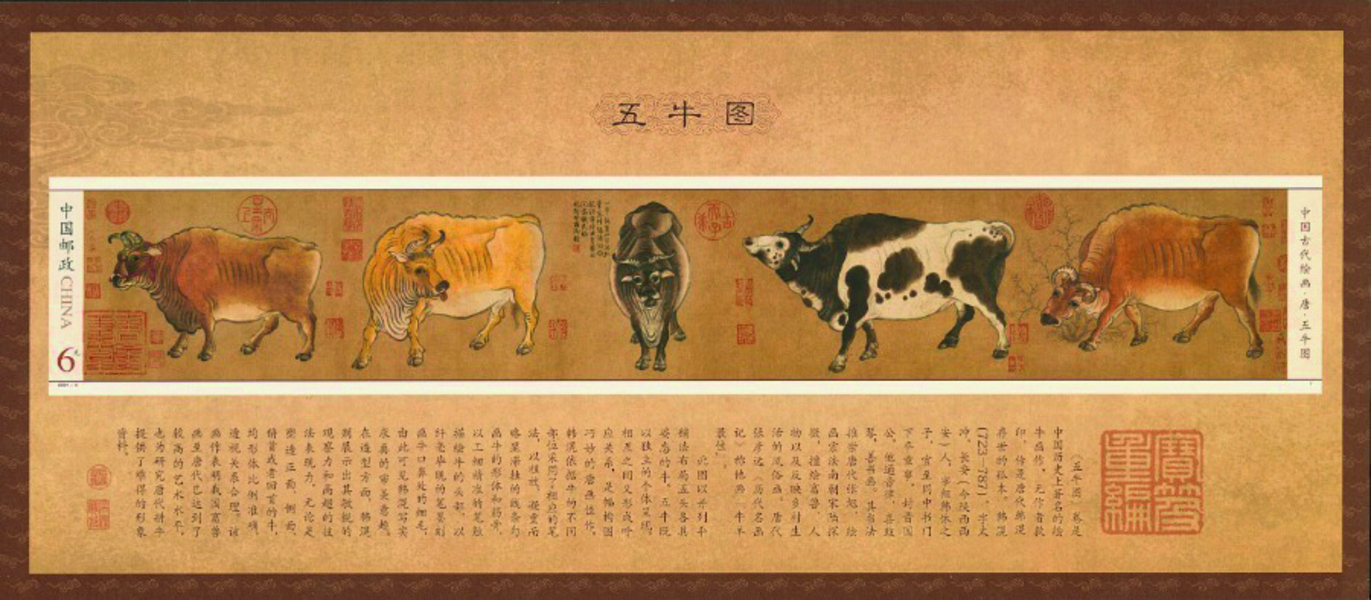Han Huang (723-787), um alto funcionário da dinastia Tang (618-907), é o autor do rolo horizontal Cinco bois (Wuniu tu, tinta e cor, 101,5 x 55,3 cm, no Museu do Palácio, em Pequim), considerada a mais antiga pintura sobre papel. A representação não possuía nenhum carimbo ou palavras a acompanhá-la mas tem hoje as marcas de poemas e carimbos dos coleccionadores, como imperadores, que a possuiram.