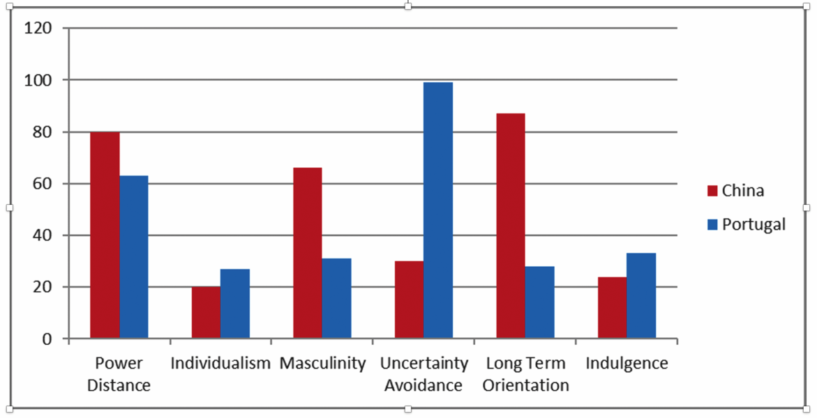 As Dimensões de Hofstede fornecem informações sobre a forma como os indivíduos de diferentes países e culturas percepcionam e interpretam o mundo, com base em seis dimensões: distância ao poder, individualismo-coletivismo, masculinidade-feminilidade, prevenção da incerteza, orientação a longo prazo e indulgência (Hofstede, 2011). Estas dimensões serão utilizadas para explorar as diferenças encontradas neste estudo. Devido à necessidade de comparar com um país específico da Europa, Portugal, como uma economia de transição europeia clássica, a Figura 1 mostra as posições culturais da China e de Portugal, destacando disparidades significativas nestas seis dimensões (Hofstede, 2011). A cultura portuguesa apresenta uma distância ao poder moderada (Índice=63), baixo individualismo (Índice=27), baixa masculinidade (Índice=31), muito elevada prevenção da incerteza (Índice=99), baixa orientação a longo prazo (Índice=28) e baixa indulgência (Índice=33). Por outro lado, a cultura chinesa demonstra uma distância ao poder muito elevada (Índice=80), um individualismo muito baixo (Índice=20), uma masculinidade elevada (Índice=66), uma prevenção da incerteza baixa (Índice=30), uma orientação a longo prazo muito elevada (Índice=87) e uma indulgência baixa (Índice=24) (Hofstede, 2011).