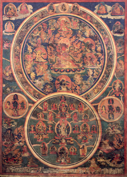 Em primeiro lugar, o estado de pureza primordial surge como um céu aberto e sem nuvens, depois aparecem as divindades pacíficas e furiosas, seguidas pelos puros reinos dos budas e, abaixo destes, pelos seis reinos da existência samsárica. (Sogyal,1992,325)
