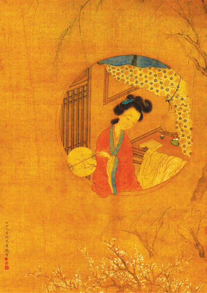 Em redor da janela, por cima, um salgueiro, alusão à saudade; em baixo, ramos de flores brancas possivelmente meihua, traduzidas habitualmente como flores de ameixieira, que também podem ser designadas como li, o seu nome de família.